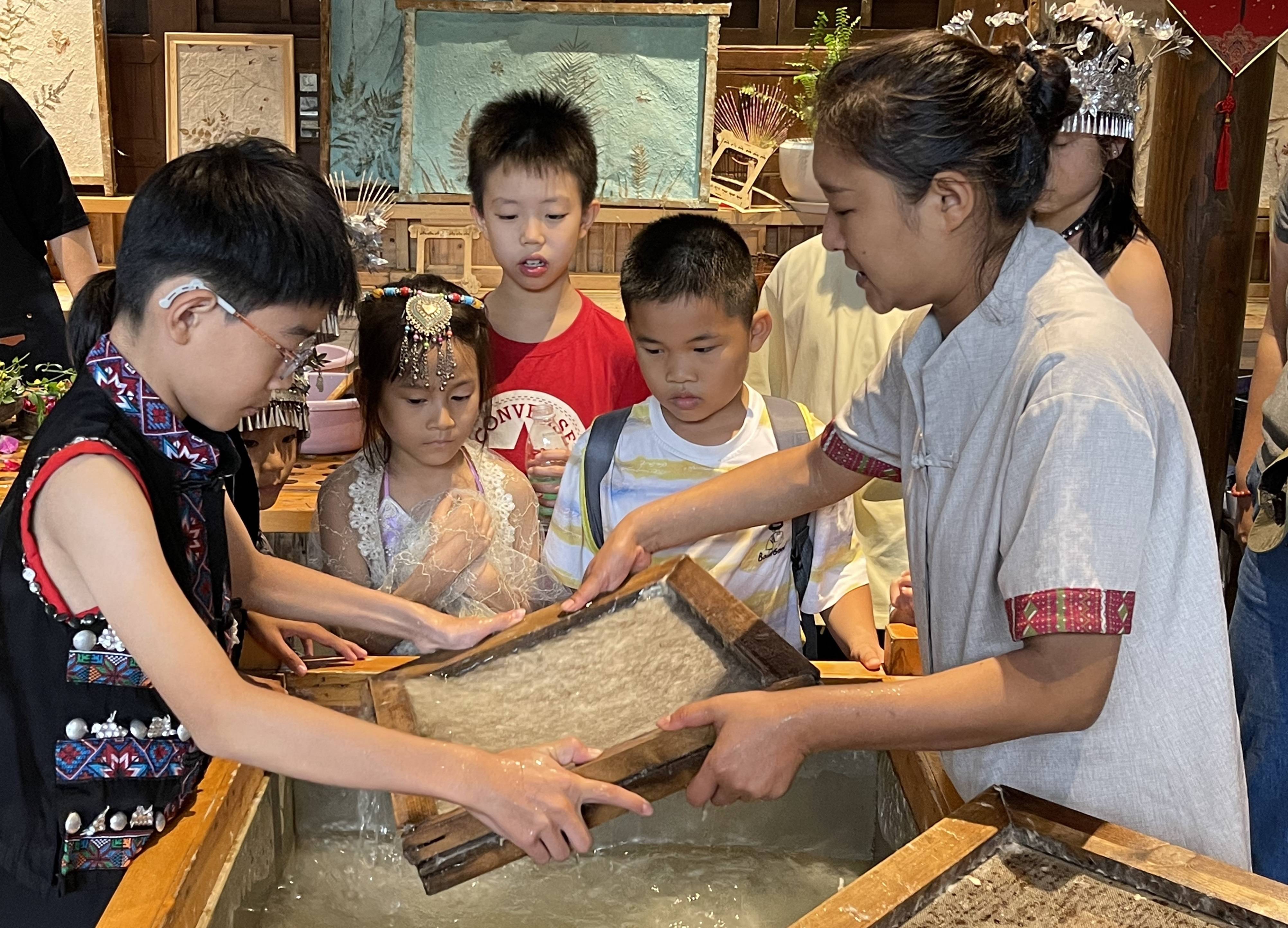 10月6日,不少学生在乌纸坊体验古法造纸。新华社记者 骆飞 摄广东中学生陈晓宇在指导下,将竹帘浸入纸浆池,捞出薄如蝉翼的纸胚,兴奋地说:“原来纸是这么做的,亲手做特别有趣!”作坊还创新推出花草纸体验,家长与孩子一起铺上花草,制作独一无二的工艺品。