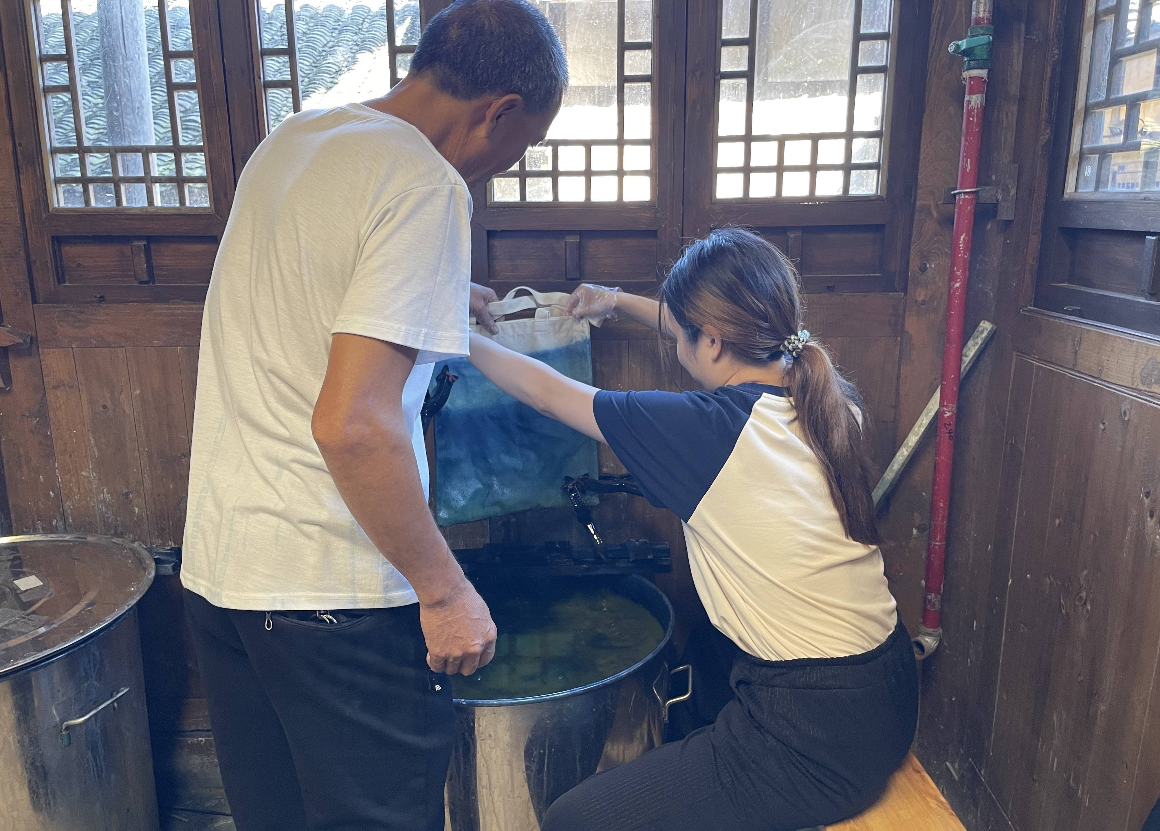 不远处的和平染坊里,蓝靛染布料随风飘动,游客们围坐一起,手中的白布正经历民族非遗技艺的“蜕变”。